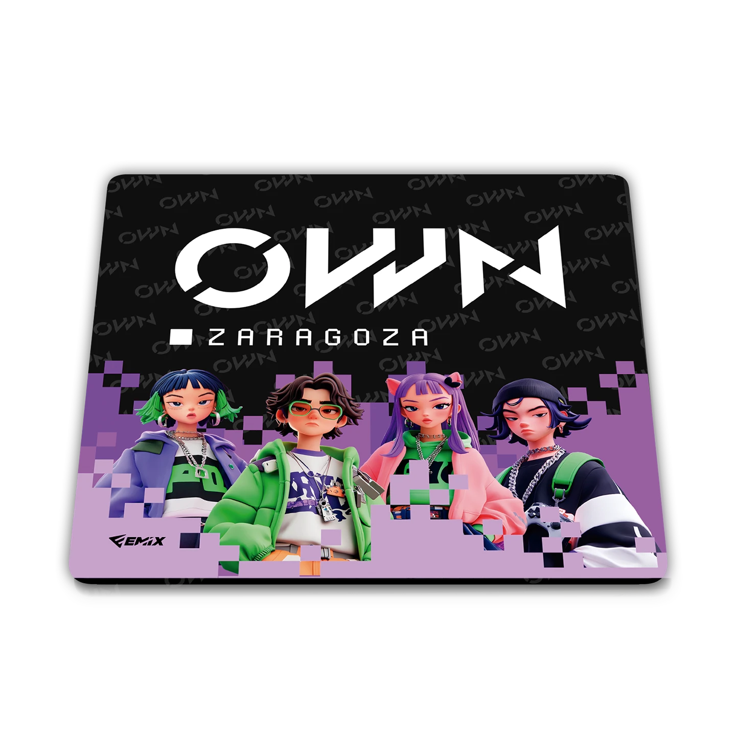 Transforma tu espacio de juego o trabajo con esta alfombrilla de ratón de gran formato (37×37 cm), diseñada para destacar tanto en estilo como en funcionalidad. El diseño presenta cuatro personajes animados con estética urbana y vibrante, sobre un fondo negro con patrón repetido “OWN” y un degradado pixelado en púrpura que añade un toque retro-futurista irresistible.