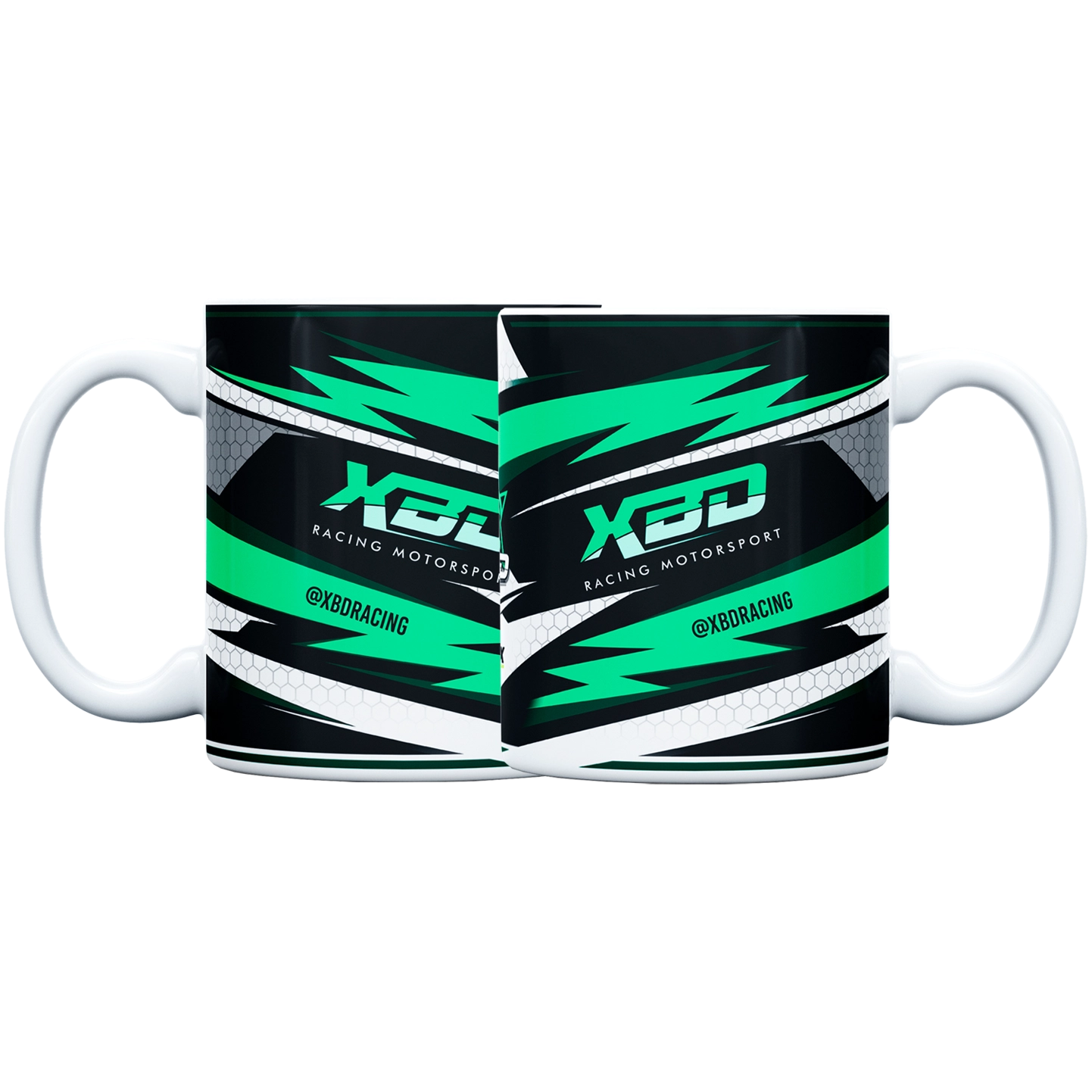 - Diseño con carácter: Con un fondo dinámico en negro, blanco y verde, la taza luce el logo de XBD Racing y un patrón inspirado en la velocidad y la competición.